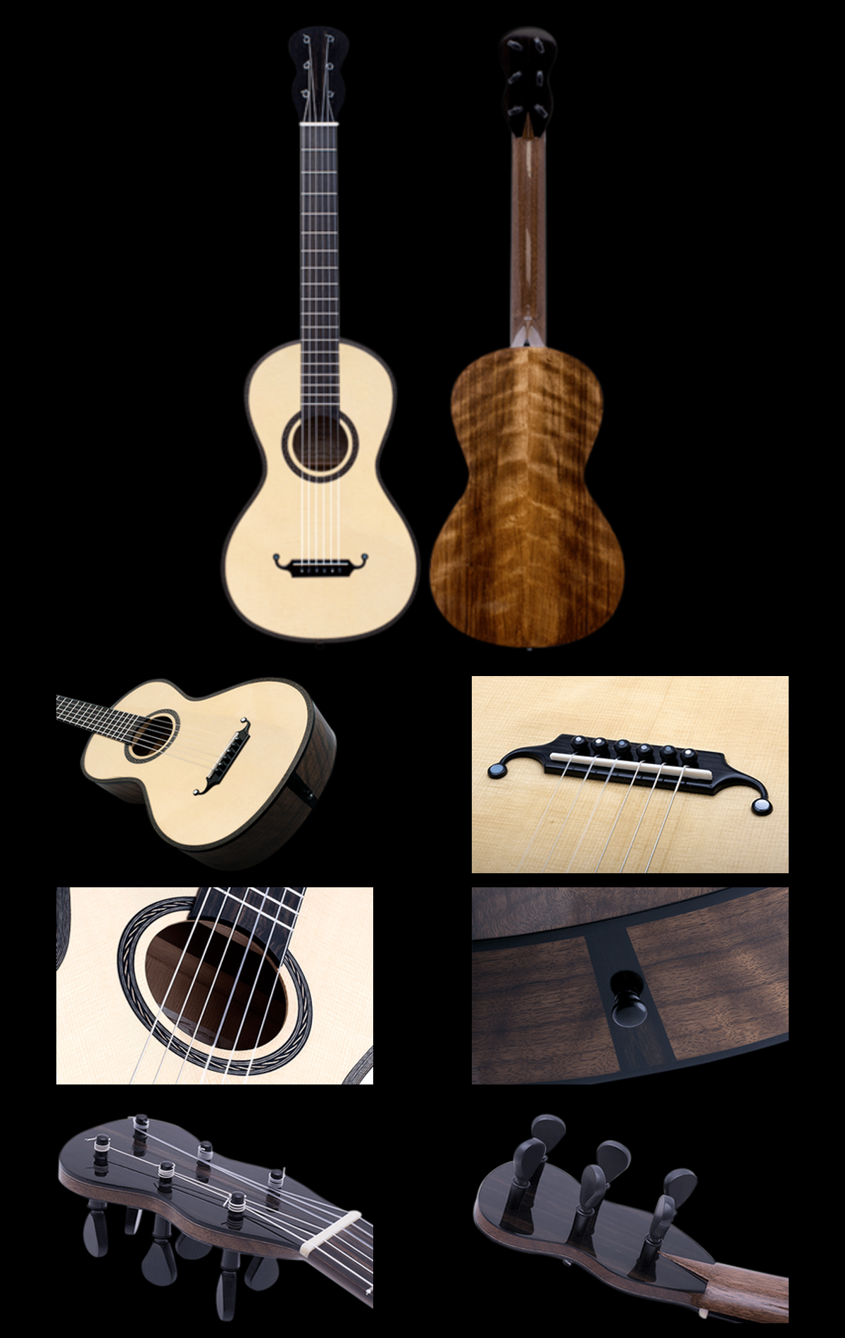 Rosettes and purflings are executed in black-and-white dyed maple. Bindings, headstock plates, bridge, and fingerboard are made from either Macassar or Gabon ebony.