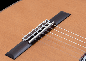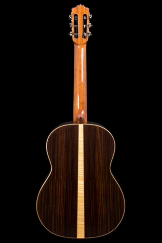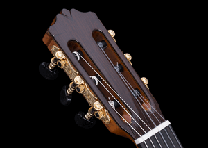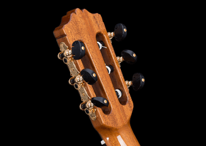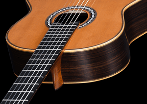 Constructed of a solid Canadian cedar top and solid Indian rosewood back and sides, this guitar includes several nice touches including a vintage styled hand-inlaid mother-of-pearl and ebony rosette, a beautiful flamed maple wedge on its solid Indian rosewood back complemented by elegant maple bindings, and a very attractive set of tuning machines with ebony handles. The neck is carved in traditional classical profile and has an ebony fingerboard. The adjustable truss rod allows you to really dial-in the action. Very cleanly built both inside and out, this instrument dons an impeccable high gloss PU finish laid on at just the right thickness to protect the instrument but not mask its natural beauty. Comes with a Cordoba HumiCase humidified hardshell archtop case. Also available with a solid European spruce top.