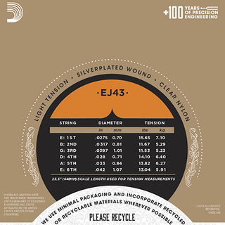D’Addario EJ43 is the lightest tension available in the Pro-Arté series. Great for beginners or experienced players with a lighter touch, they provide ease of play without sacrificing rich tone. The EJ43 Pro-Arté treble strings are sorted by a sophisticated computer-controlled laser machine which performs diameter and tension measurements, ensuring true-sounding, precise trebles in every set. EJ43 basses are wound using silverplated copper on a multi-filament nylon core for consistent and warm, yet projecting tone.