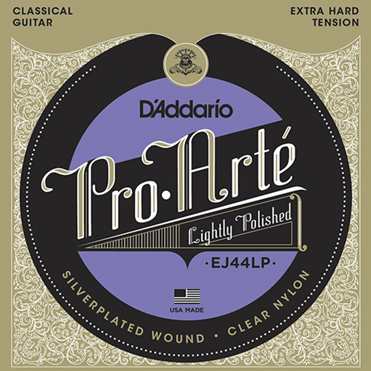 D’Addario EJ44LP lightly polished, extra-hard tension classical guitar strings are optimal for maximum string resistance and projection without compromising tone. Pro-Arté lightly polished composite strings feature an exclusive multifilament core material which delivers a powerful, but warm tone which lasts 2–3 times longer than traditional classical strings. Each wound string is polished to a smooth surface for reduced finger noise. In addition to three traditional nylon treble strings, the EJ44LP set contains an optional monofilament composite 3rd/G string, which provides greater projection and optimal balance between basses and trebles. All Pro-Arté treble strings are sorted by a sophisticated computer-controlled laser machine which performs diameter/tension measurements and quality checks, ensuring true sounding, precise trebles in every set. Pro-Arté lightly polished sets are also ideal for recording.