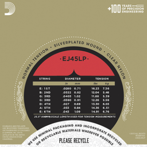 The normal tension D’Addario EJ45LP is the best selling lightly polished Pro-Arté set, preferred for its balance of rich tone and smooth feel. Pro-Arté lightly polished composite strings feature an exclusive multifilament core material which delivers a powerful, but warm tone which lasts 2–3 times longer than traditional classical strings. Each wound string is polished to a smooth surface for reduced finger noise. In addition to three traditional nylon treble strings, the EJ45LP set contains an optional monofilament composite 3rd/G string, which provides greater projection and optimal balance between basses and trebles. All Pro-Arté treble strings are sorted by a sophisticated computer-controlled laser machine which performs diameter/tension measurements and quality checks, ensuring true sounding, precise trebles in every set. Pro-Arté lightly polished sets are also ideal for recording.