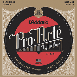The normal tension D’Addario EJ49 classical guitar strings contain black nylon trebles, preferred for their balance of rich tone, comfortable feel and dynamic projection. Like in all Pro-Arte sets, the EJ49 treble strings are sorted by a sophisticated computer-controlled laser machine which performs diameter and tension measurements, ensuring true-sounding, precise trebles in every set. The EJ49 basses are wound using silverplated copper on a multi-filament nylon core for consistent and warm, yet projecting tone.