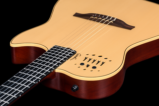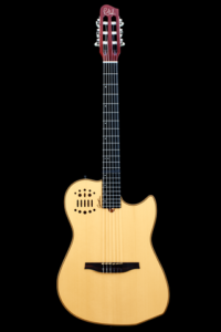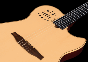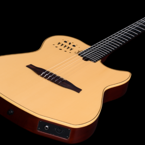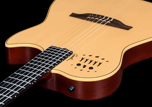 The Multiac Duet Ambiance nylon string also features a 25 ½” scale and slimmer nut width than the classically inspired Grand Concert Duet Ambiance, making it easy for electric steel string players to transition to nylon strings. This model features a chambered mahogany body with a solid spruce top, as well as a dual source preamp with feedback control and an undersaddle transducer.