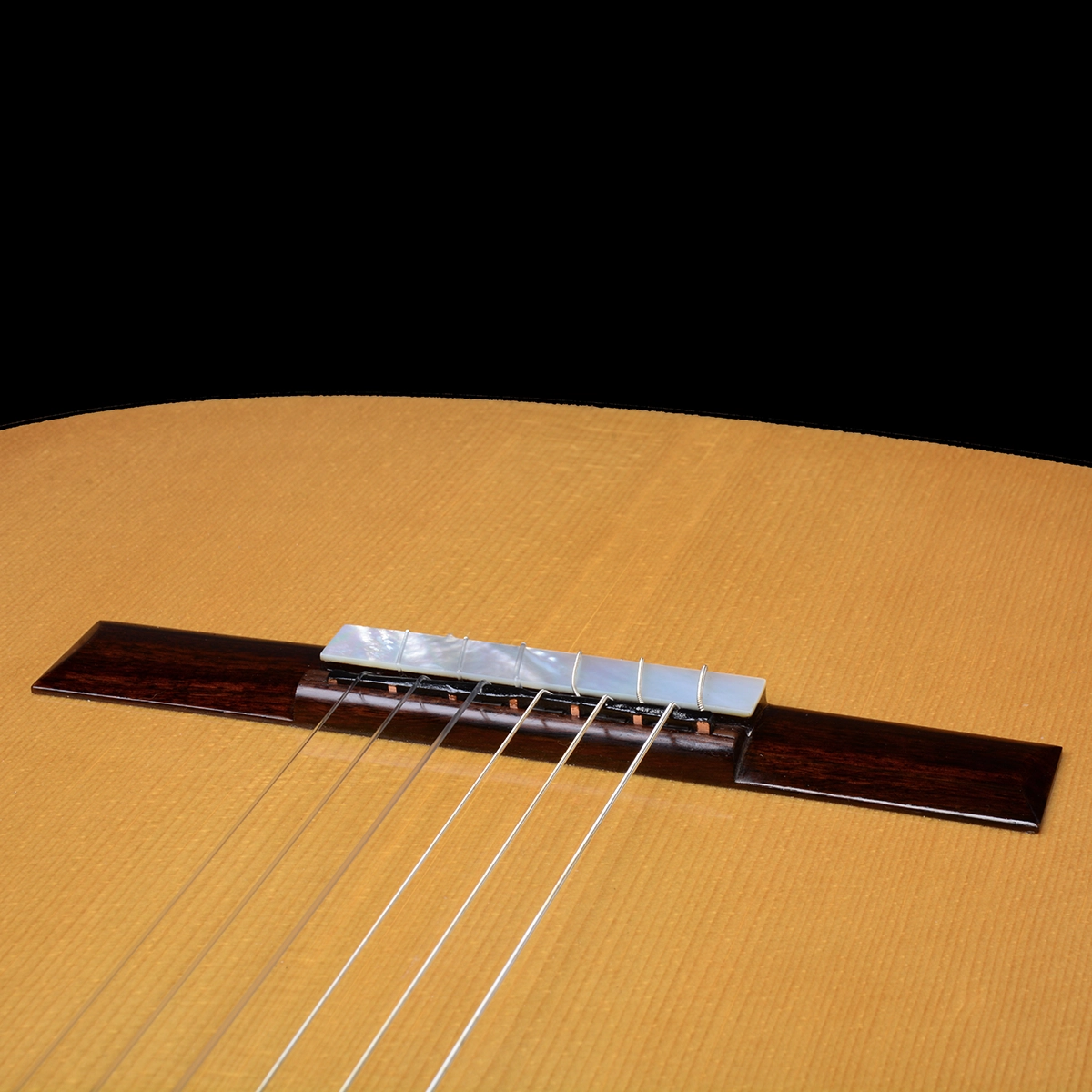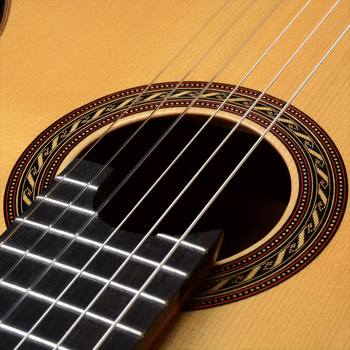 The Spanish cedar neck and headstock are joined with a wonderfully executed V joint. The thickness and shape of the neck, and the relief of the elevated ebony fingerboard, as well as the string setup have been optimized to make this guitar a dream to play. The neck is installed with a two-way adjustable truss rod to allow a quick relief adjustment to suit the player’s requirements. The elevated fingerboard configuration of this Hill Signature guitar serves two purposes: (1) it changes the way the strings pull on the top, promoting efficient vibrational transfer; and (2) it gives the player easier access to the upper register above the 12th fret.