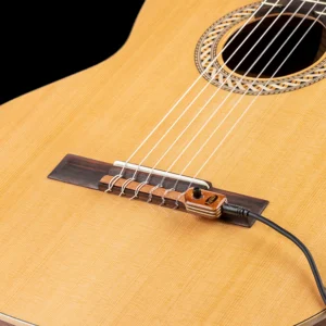 Because the sensor is positioned at the bridge rather than beneath the saddle, it produces a more immediate and percussive response. This placement preserves articulation, right-hand nuance, and dynamic contrast—qualities that are often lost in traditional undersaddle systems. The result is a clear, balanced signal without the compressed character commonly associated with piezo pickups.