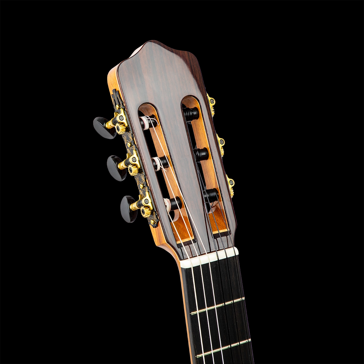 Patagonian rosewood back and sides add harmonic depth without blurring note separation. Compared to traditional cypress, rosewood introduces a slightly fuller voice while preserving the articulation flamenco players rely on.