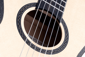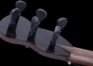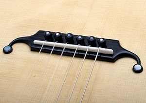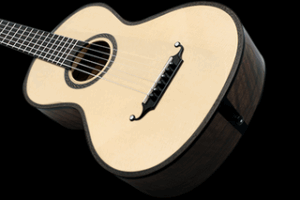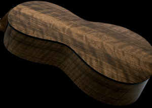 My Lacote style guitars are interpretations of Rene Lacote’s traditional paddle-type or figure-8 headstock creations with the fingerboard resting on the top of the instrument as opposed flush with body. Unlike the originals, both the back and sides are lined with top grade sitka spruce as opposed to just the back. I hand select fine Australian curly wlanut veneers for the back and sides. The bookmatched back and matching side sets are striking. I have a limited number of sets of this wood. Other than the Planetary Pegs and neck mounting hardware the guitar is entirely crafted by me using both hand tools and CNC technology in my Morganton, NC shop.