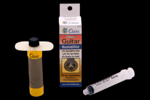 Using a specially designed evaporative membrane to maximize humidification, the Oasis OH5 Plus+ humidifier is suitable for extremely dry environments with humidity levels below 25%. If your room is moderately dry, with its typical humidity between 25% and 40%, we recommend the Blue Oasis OH1 model instead. In conditions above 40% humidity, you should NOT use a humidifier at all. Typically, humidity drops in the fall and rises in the spring, so you may not need to humidify your guitar all year round, or you may switch between the OH5 and OH1 models as needed. It’s best to use hygrometers to determine the exact humidity levels both inside and outside your guitar case.