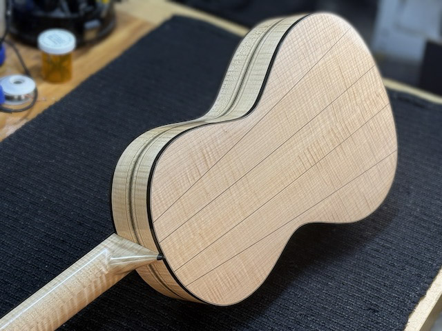 I keep the details clean and monochromatic, echoing the understated elegance of the period, but the instrument gives me space to put my own fingerprint on the design. The back, on one of my models, for example, is a book-matched five-piece layoutâmy signature patternâcarefully selected and joined so the grain lines flow in a deliberate, balanced rhythm. The sides follow suit: a two-piece laminated construction with a decorative purfling strip that adds both refinement and a sense of continuity across the body. These are conscious choices, not embellishments for their own sake, but aesthetic markers that say, âThis is a Marfione.â