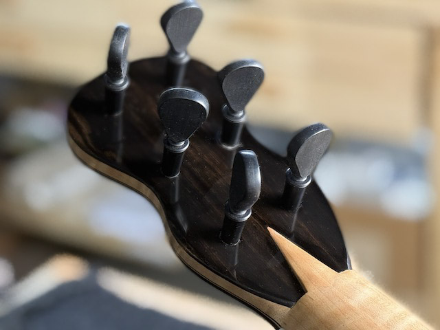 And since the headstock is already a focal point of the instrument, I treat it with the same blend of tradition and personal signature. Where many LacĂ´tes used a simple hardwood faceplate, I build a more distinctive black-white-black sandwich by layering natural maple with a dyed-black veneer. Itâs subtle enough to sit comfortably within the Romantic lineage, yet unmistakably mine. Paired with Pegheds, the headstock becomes both a functional upgrade and an aesthetic statementâa perfect example of how I merge historical inspiration with modern craftsmanship.